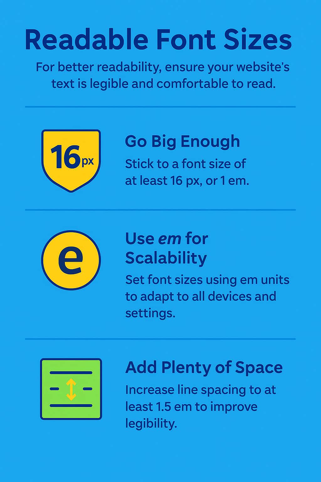 Small text is costing you customers. For better readability and accessibility, set your body text (the readable font sizes) to at least 16 px (or 1 em) and use em units instead of pixels so your site adapts to different screen sizes and zoom settings, especially on mobile. Add comfortable line spacing (about 1.5 em), and you’ll make your site easier to read, more trustworthy, and more effective. Let’s Chat if you’d like help making your website more readable and accessible.